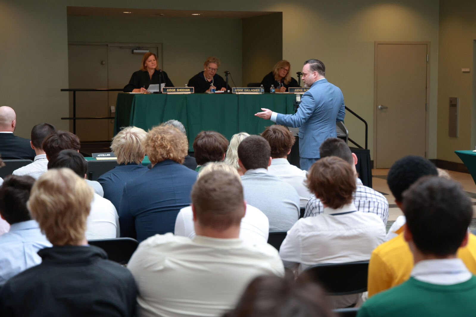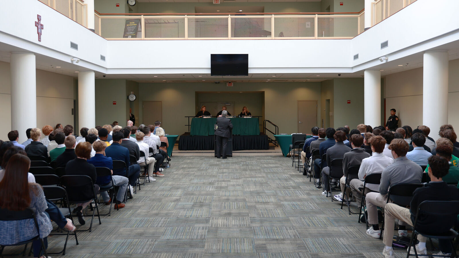 Administrative Judge Gallagher welcomes attendees to her mobile courtroom inside the Jack Kahl '58 Student Life & Leadership Center, preparing the students for what they are about to witness: a live appellate hearing on a homicide case. “This isn’t a mock trial,” she tells them. “We’re hearing an actual appeal. This is an opportunity.”