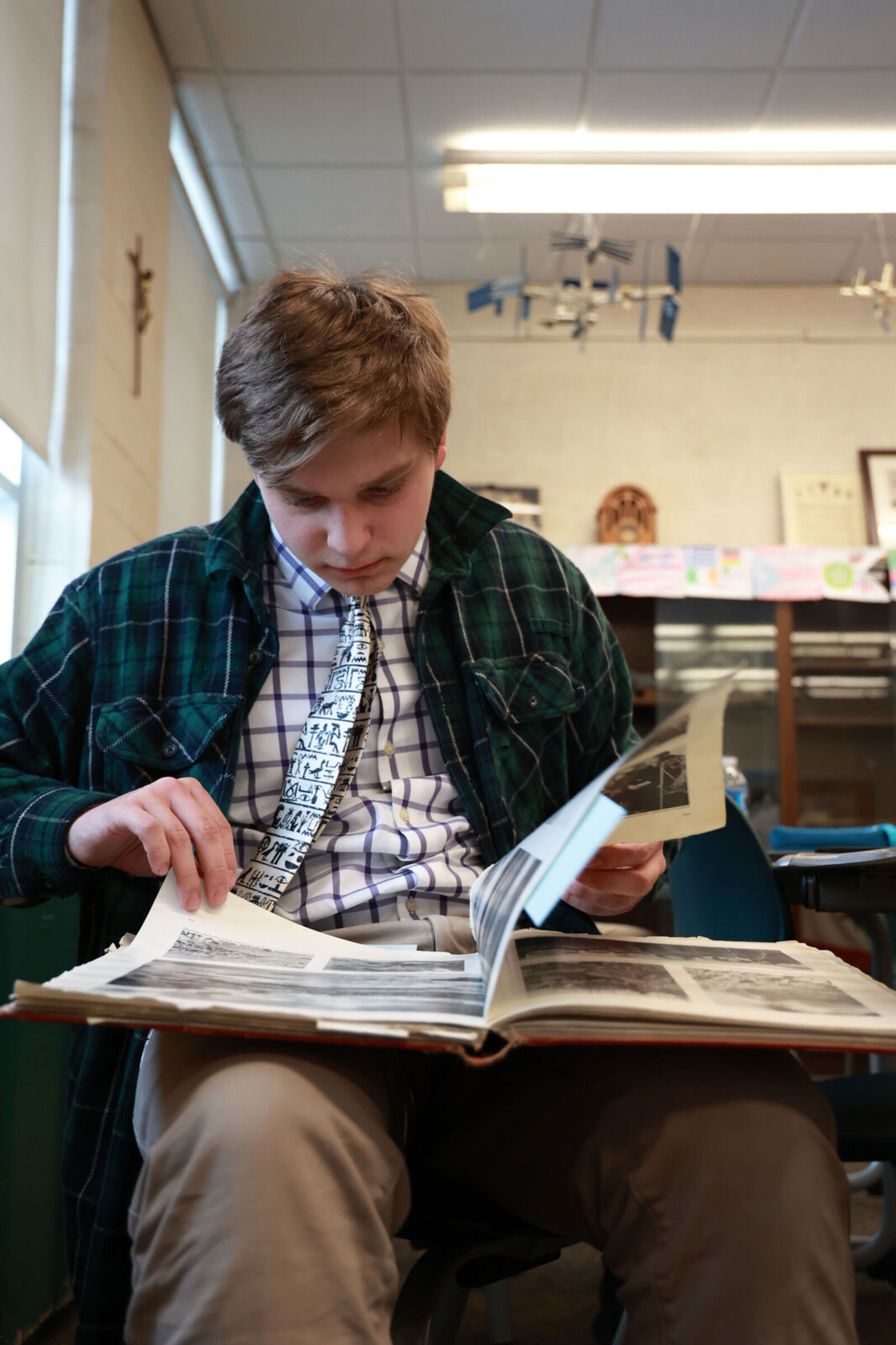 Helmets, uniforms, maps, medals, and fragments of distant conflicts rest only steps from students’ desks. Nearby, pieces of Greek pottery, delicate Asian scrolls, and Egyptian cartouches offer glimpses into civilizations thousands of years old. What was once Br. Bennet’s classroom is still a place of instruction—where the work of preserving and understanding the past quietly passes from one generation of historians to the next.