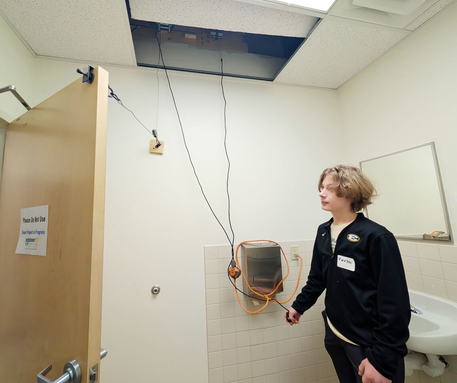 The team developed a mechanical door-opening solution using a winch-and-pulley system to help Alex open heavy commercial doors at her workplace without requiring structural renovation. This is particularly helpful for the restroom door and allows her the dignity of privacy and independence.