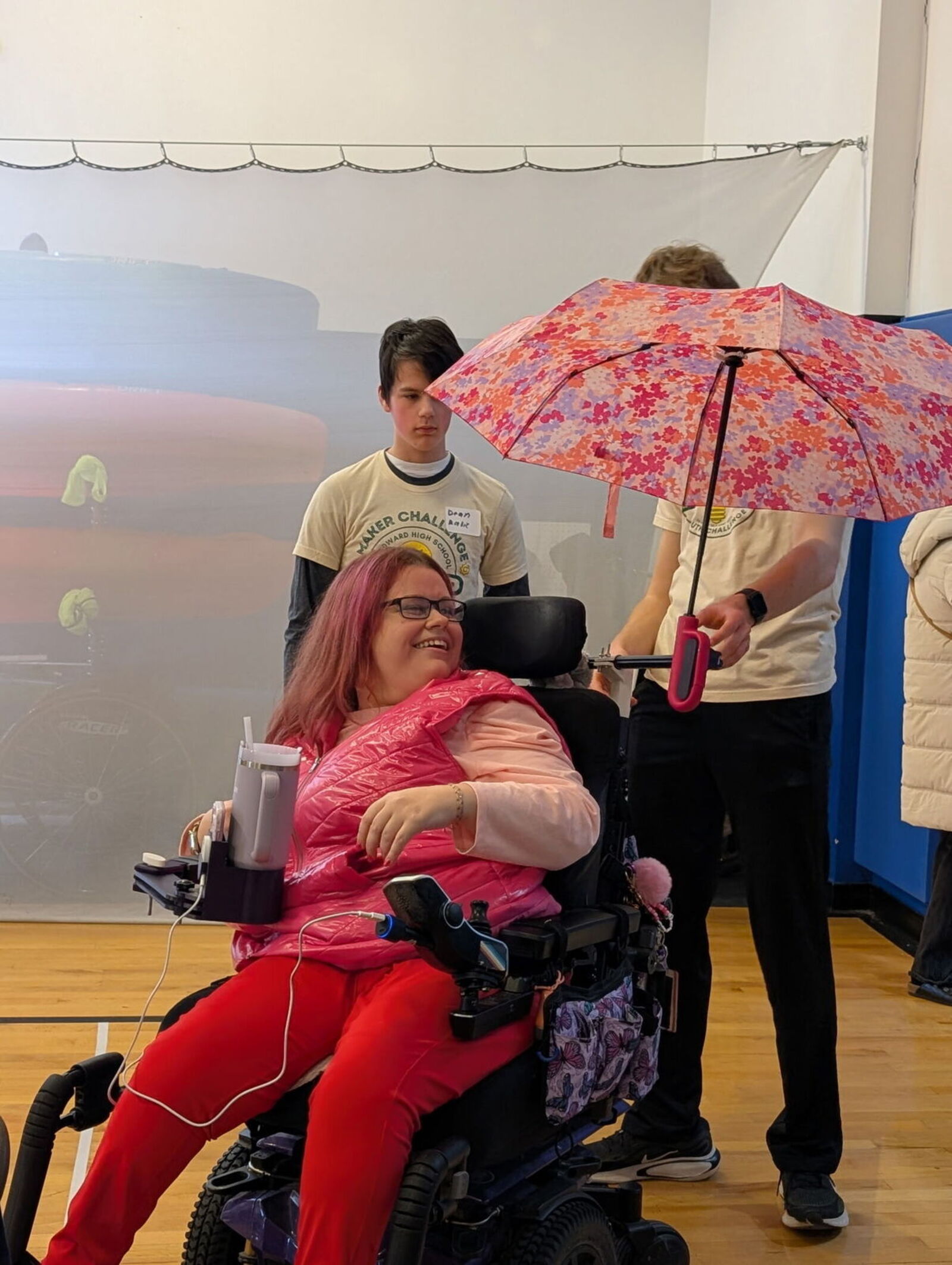 The team designed modular wheelchair-mounted accessories, including a custom cup holder, a phone mount with wireless charging, and an umbrella holder—all integrated directly into her power wheelchair.